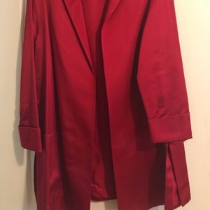 Beautiful red jacket- great for all year but perfect for Christmas- is a rayon/silk blend- looks and feels like a fine satin jacket- Light weight, lined, very attractive and a quality piece. Great with dress pants, short or long skirts or even jazz up a pair of jeans. made in New York. Generous front pockets. You won't be disappointed.
