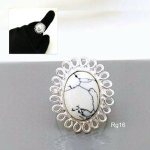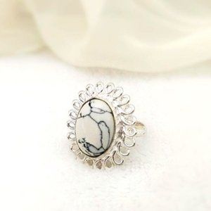 Lovely Ring Howlite Gem White Grey Silver Filigree