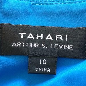 EUC Royal Blue Dress. Size:10. Measures: underarm to underarm- 19", Length- 37", waist- 15". Has a draped collar, cap sleeves, hidden zipper, fully lined. Ties on left side of dress. Darts on bodice and down from waist. See Photos. Small slit at back bottom. TAHARI -Arthur S. Levine Designer. Materials: 63% Polyester, 33% Rayon and 4% Spandex for a nice fit. Material has a nice feel to it. Washing Instructions: Tag recommends Dry Clean Only. But I believe you can wash on delicate setting and iron on low iron.