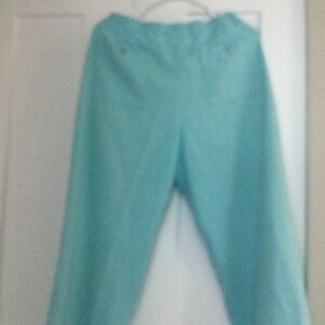 Lovely summer capris in a gorgeous aqua blue for summer. Drawstring front waist, two deep side pockets, two back pockets, very comfortable in excellent condition. Lovely material is 55% Linen, and 45% Viscose, drapes lovely, and the ultimate summer Capri for comfort. Leg length from waist is 33”, and inside leg is 23” . Purchased in UK., UK 14.