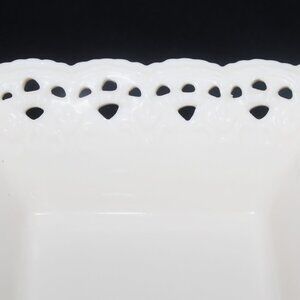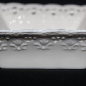 A lovely and delicate fine porcelain dish that would be ideal as a trinket/jewelry dish on your vanity or dresser. Made by Skye McGhie, Cream Lace features a scallped edge and fleur de lis motif on the inside and outside trims.