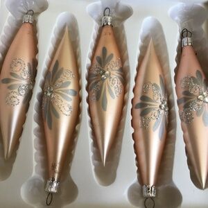 These 5 ornaments are in good vintage condition. They are a pale pink and embellished with silver.. They are made in Czechoslovakia for Alderbrook.