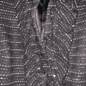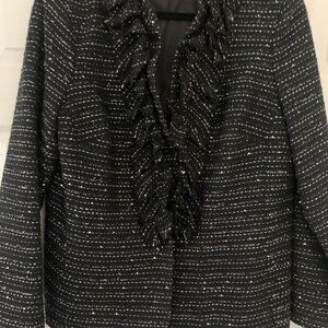 Lovely jacket black with silver and white threads and subtle sequins. Lovely ruffle design and front, great for eveing or dress with jeans