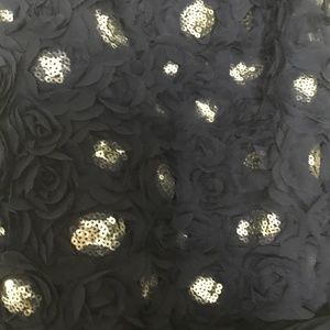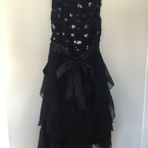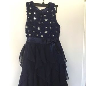 Navy with silver sequinned roses..and whispy bottom..knee length..very gently used..great for special occasions