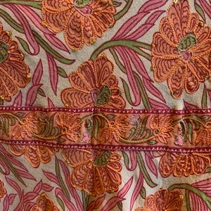 This is a unique summery skirt, with metallic detail on a pink and orange floral pattern, falls below knee