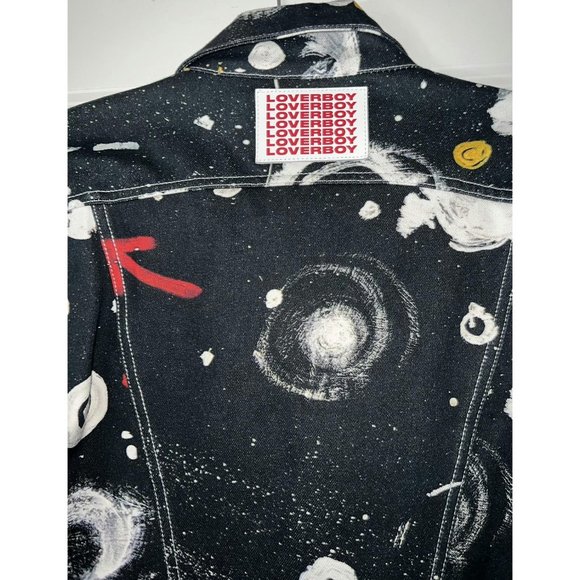 Black cotton cropped asteroids print denim jacket from Charles Jeffrey Loverboy featuring a front button fastening, long sleeves, a cropped length, a straight hem, a stitch detail and asteroids print.