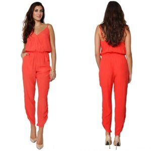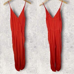 Loves + Friends Jubilee Jumpsuit in Orange and Women's Size Medium. Bright orange colour called terracota. This easy crepe jumpsuit is the perfect vacation piece. Poly blend. Wrap front with button closure. Adjustable shoulder straps. Front slant pockets. Elastic waist. Retails for $126 USD (approximately $175 CAD). Cinched legs. 57% viscose and 43% rayon. Hand wash.