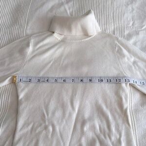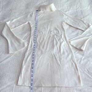 Size Small - 69% nylon 31% viscose - Hand wash cold - Unlined - Knit fabric - Rib knit fabric - Bodycon dress with classic fold over turtleneck design and slightly flared sleeves