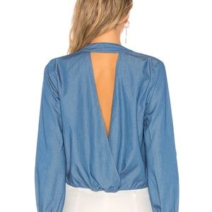 Design: Plunging neckline, plunging back, elasticized waist, buttoned sleeves.