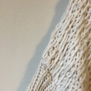 Good preowned condition, chunky, cozy, off-white, loose knit button down cardigan sweater by Lovestitch. Perfect hug of warmth for those chilly months ahead. This is meant to have a fuzzy frumpy look, however, there is some reinforcement on the arms that feels somewhat stiff. It is only on the seamline and only on the loose knit area. Other than that, it's super cute.