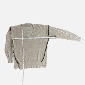 Embrace effortless comfort with this ultra-soft sweater, designed with a lounge-inspired extended length that elegantly drapes below the hip. It features a classic v-neckline, relaxed dropped shoulders, and an exposed seam highlighted by a contrasting blanket stitch. Pair it with your favorite relaxed denim for a chic, casual look.