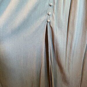 A solid maternity maxi dress with a deep v-neckline, button down closure in front. Skirt is lined. Pocketed.