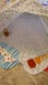 Teal teething ring with crinkle mosaic fabric tie, small yellow stain on one corner