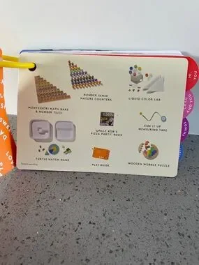 Bright orange board book play guide from Lovevery. Chunky tabs and a yellow ring for easy handling. Simple activities and development tips inside. Bold orange cover with white and black text. Good preowned condition