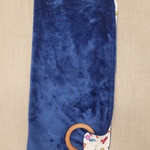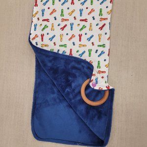 Handmade lovey approx.17" x 17" makes it a great size for a small blanket, lovey or burp cloth. Soft minky navy fabric on one side and rainbow tool fabric on the other. Wooden ring is detachable for ease of washing.