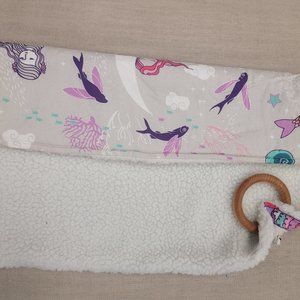 Handmade lovey approx.17" x 17" makes it a great size for a small blanket, lovey or burp cloth. Soft fabric on one side and mermaid fabric on the other. Wooden ring is detachable for ease of washing.