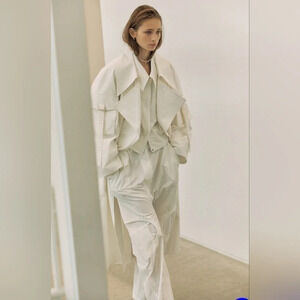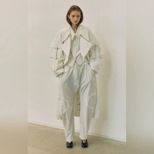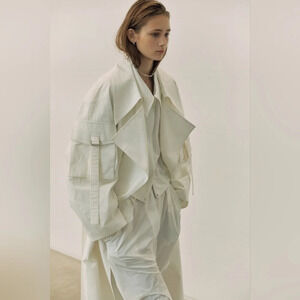 Architectural and geometric aesthetic minimalism are at the heart of this trenchcoat. Lei He pioneers innovative technologies and applies them.