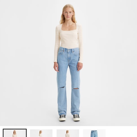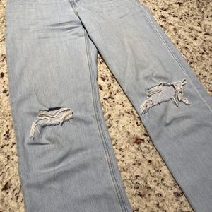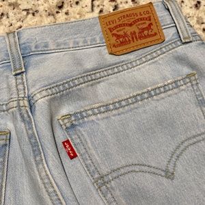 Light wash Levi’s jeans. Mid rise, straight leg, ripped in knees. Size 27 x 32. Perfect condition
