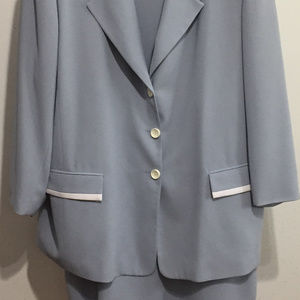 Okay, the thing I love about this powder blue dress suit, is that you can throw it in the wash on delicate and hang it to dry. The pictures show how it turns out. If you're a busy professional and don't have time to fuss with going to the dry cleaners, this ensemble could be your next go-to suit for your wardrobe. GUC with two small areas of imperfection on the dress as shown. The fabric hangs beautifully with "play" in the fabric. A simple suit for a complicated professional.