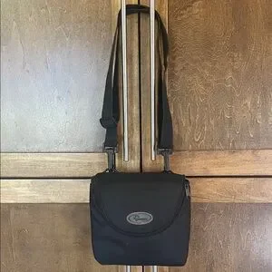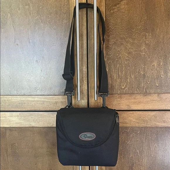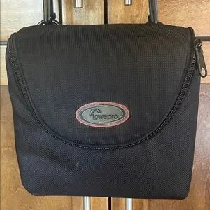Lowepro black canvas camera case with grey interior and compartments and adjustable strap. Size about 7” by 6.5”.