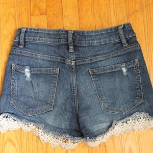 Low-rise/dark wash denim shorts with rips and white lace (Size S).