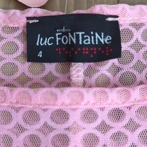 Feminine and fun, this Luc Fontaine “Twilight” tunic in soft blush pink features a sheer mesh overlay with a geometric circle pattern and a solid pink lining for comfort. The scoop neckline and three-quarter bell sleeves add a flattering, flowy touch. Perfect worn as a tunic over leggings or as a mini dress for a retro-chic look.