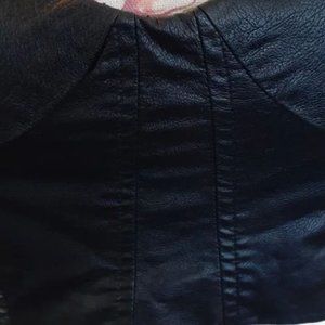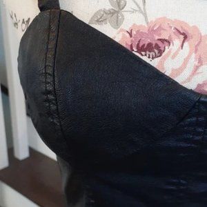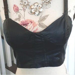 This sexy black pleather number from Lucca Couture combines all the best things about a bustier, crop and cami to make one fabulous top! Features bra cups and seaming, fully lined with a zipper up the back finished with a hook and eye to keep all your assets in place. 7 1/2" from bottom of strap to hem. In excellent unworn condition - no rips, tears or stains. (B) 7/26