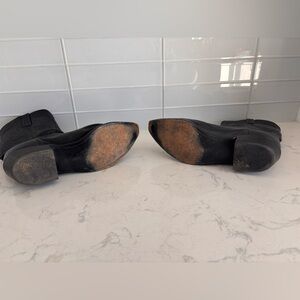 Men's western boot from Lucchese. Black Ranch Hand. Pull on straps. Lined with super soft calf skin. No other boot fits the human foot like a Lucchese boot, thanks to Lucchese's original design and meticulous construction. Handcrafted in El Paso, Texas USA, using the finest materials. 1 1/2 heel. 12 shaft. 13 1/2 circumference. Excellent Preloved condition.