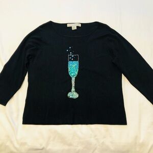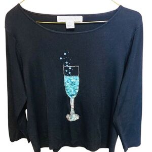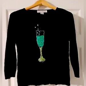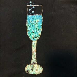 Make a statement with this striking black top by designer Lucia Burns. The pullover top has long sleeves making it easy to wear and comfortable for any occasion. It features a tall wine/ Champagne glass with colorful sparkly sequins adding touch of whimsy.