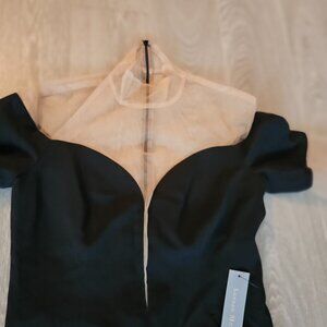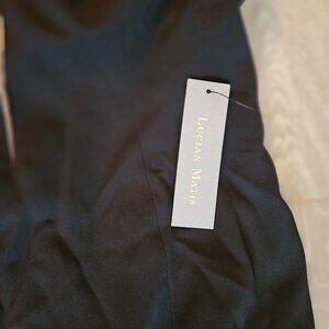An evening dress by Canadian designer Lucian Matis. This classic, vintage style is good for a gala or a evening wedding. The neckline and sleeves are of a tan mesh, providing covering. The material is synthetic, possibly polyester. Chest (laid flat) 16", hips: 19", length in front: 48", back: 64". Size 10 on the tag but more like a size 8 or a small size 10. It doesn't have a lot of stretch but will suck you in. It does have narrow arms, maybe 10" around.