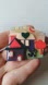 This adorable handcrafted pin was created by layering decorative paper over very thin slices of wood or plastic which is decorated with paint and embellishments and then clear coated with resin.
