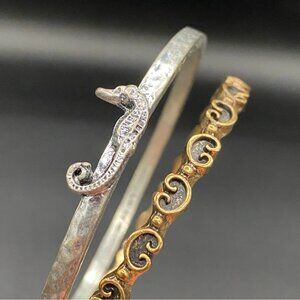 Cute bangles with scroll design in antiqued bronze finish and hammered silvertone bangle with seahorse