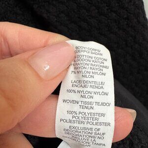 Chic and long black sweater from Lucky Brand, featuring a lace-trim hem. Made in a smoke-free and pet-free environment. Size L, composed of 41% rayon, 7% nylon, with a 100% nylon lace and 100% polyester woven underlayer. Perfect for a stylish, comfortable look. Excellent condition, no visible flaws.