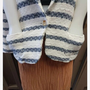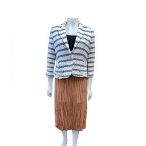 White with navy stripes, this cropped blazer features two pockets and a one button closure. Fully lined, with long sleeves. Little to no stretch available.