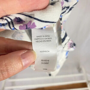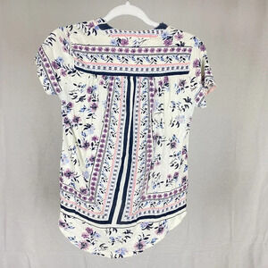 Lucky Brand Boho Floral White Purple Print V Neck Short Sleeve Top