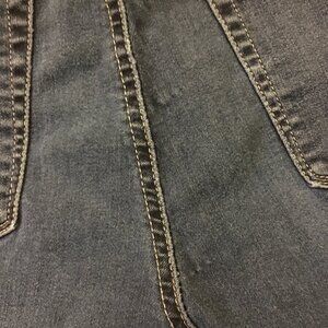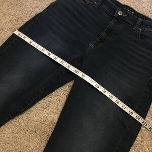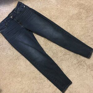 Good preowned condition, dark blue slim/skinny (taper at the ankles) fit denim jeans by Lucky Brand with some light distressing at the hips. Very nice quality and durability. There is some slight wear on the back/butt, but nothing too glaring (please see close up photo).
