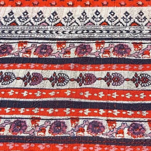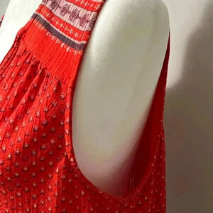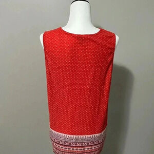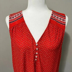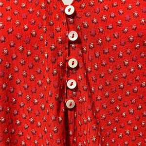 Excellent condition! Deep v-neck with button accent. Lightweight polyester - material tag removed. Poppy red with white & blue. Straight hem. Measurements: Length 25” Width 19.5”