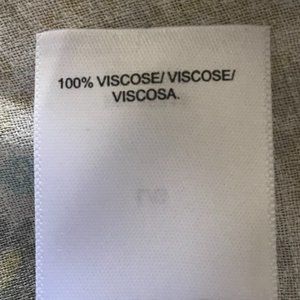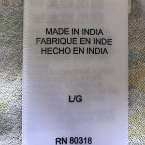 Size: Large. 100% viscose. V-neck. Ruffled sleeves. Yellow, blue, and tan floral print.