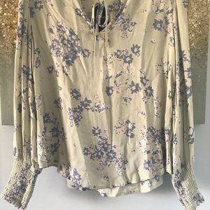 Size: Medium. 100% viscose. Blue and pink floral pattern. Tie closure at neck.