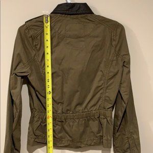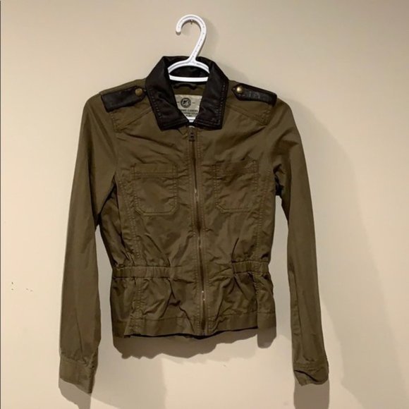 EUC Lucky Brand army green military jacket with brown faux leather epaulets in women’s size XS.