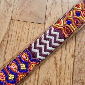 This Lucky Brand Women's Belt is a size Small with a medium width and crafted from 100% Genuine Leather in a stylish brown color. The belt features intricate embroidery and beaded accents in a multi-colored Aztec Boho design, adding a unique and trendy touch to any outfit. With a Western belt style and brass hardware, this accessory is perfect for those who enjoy a Hippie, Bohemian, or Southwestern-inspired look. Made in India, this belt is sure to make a fashionable statement for any woman's wardrobe.