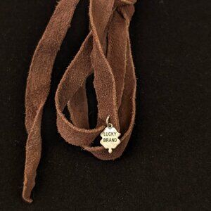 This necklace by Lucky Brand is made of a gold tone metal and has a brown suede cord that knots behind the neck as a closure, and a stamped 4-leaf clover shaped maker's tag. The pendant is large and rectangular with a bail attached to its top. The "main" side of the pendant features a large blue faceted plastic stone, and the "back" side has a floral pattern in the metal. The necklace can be worn with either side of the pendant facing outward. There is normal wear, including some tone distress in the metal around the blue pendant stone, but no issues affecting wearability.