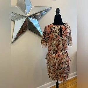 Rose print dress with ruffles and glitter thread that runs throughout. Detachable waist tie