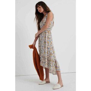 Lucky Brand Sleeveless Felice Dress Blue Multi made in a flattering silhouette of a smocked waist with a drawstring, v-neck, ruffle bottom and high-low hem. Features a paisley print that’s perfect for standing out in any room. Pre-owned in excellent condition.