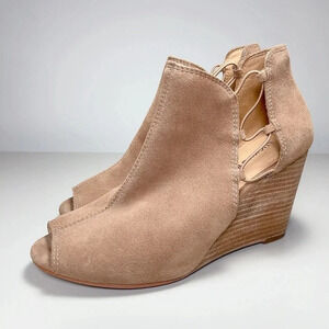 Lucky Brand Stacked Wedge Heel Suede Booties Sesame Brown Tan