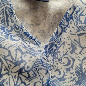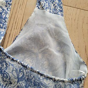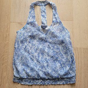 Lucky Brand racerback tank top in a soft blue and white tile-inspired floral print. Size Medium. Features a flowy fit with smocked hem for comfort and a boho-chic vibe. Lightweight and breathable—perfect for summer days, beach trips, or layering under a denim jacket.