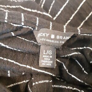 Lucky Brand Tie Neck Keyhole Boho Womens Large Top Black White Stripe Semi Sheer Elastic Hem and Sleeve Ends Lightweight