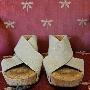 Lucky Brand, light and comfy cork wedge sandals; size US 7.5M or Euro 37.5. These beautiful, lightweight sandals have a 3.5" wedge height at heel, 1" at toe, so easy to wear all day as the crisscross strapping is made of soft elastic that really hugs your foot. The footbed is a cushioned cork as well. Perfect addition to your summer wardrobe.