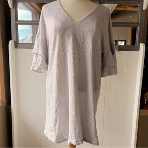 Soft and comfy textured knit v- neck shift dress. Dolman three-quarter ruffled sleeves with dropped shoulders. In Excellent Pre-loved condition💕