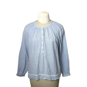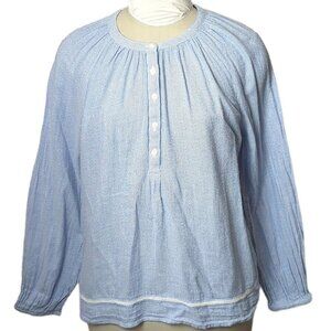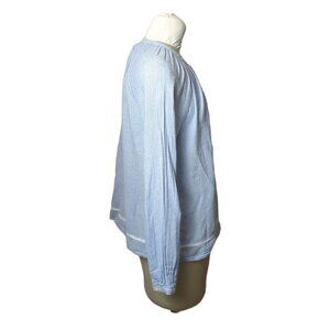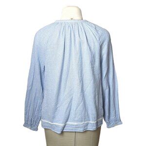 This is a blue and white woven stripe half button boho style blouse by Lucky Brand.